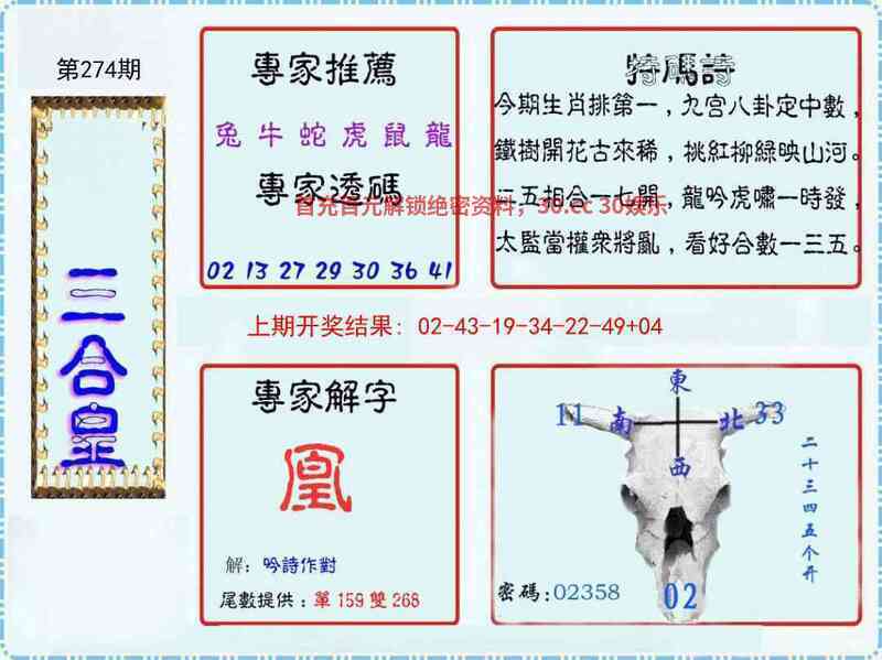 276期特码诗:今期生肖三八開,七步成詩真天子,烟花三月下江南,紅綠特碼送彩民。二七合三起一六,午夜鐘聲更夫敲,鐵樹銀花送英雄,龍風呈祥慶太平。