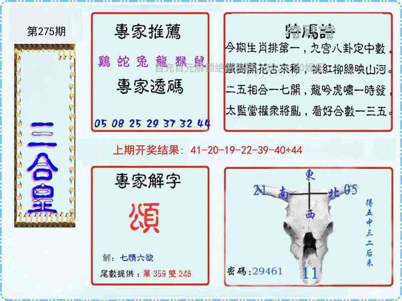 275期特码诗:今期生肖排第一,九宫八卦定中數,鐵樹開花古來稀,桃紅柳綠映山河。二五相合一七開,龍吟虎嘯一時發,太監當權眾將亂,看好合數一三五。
